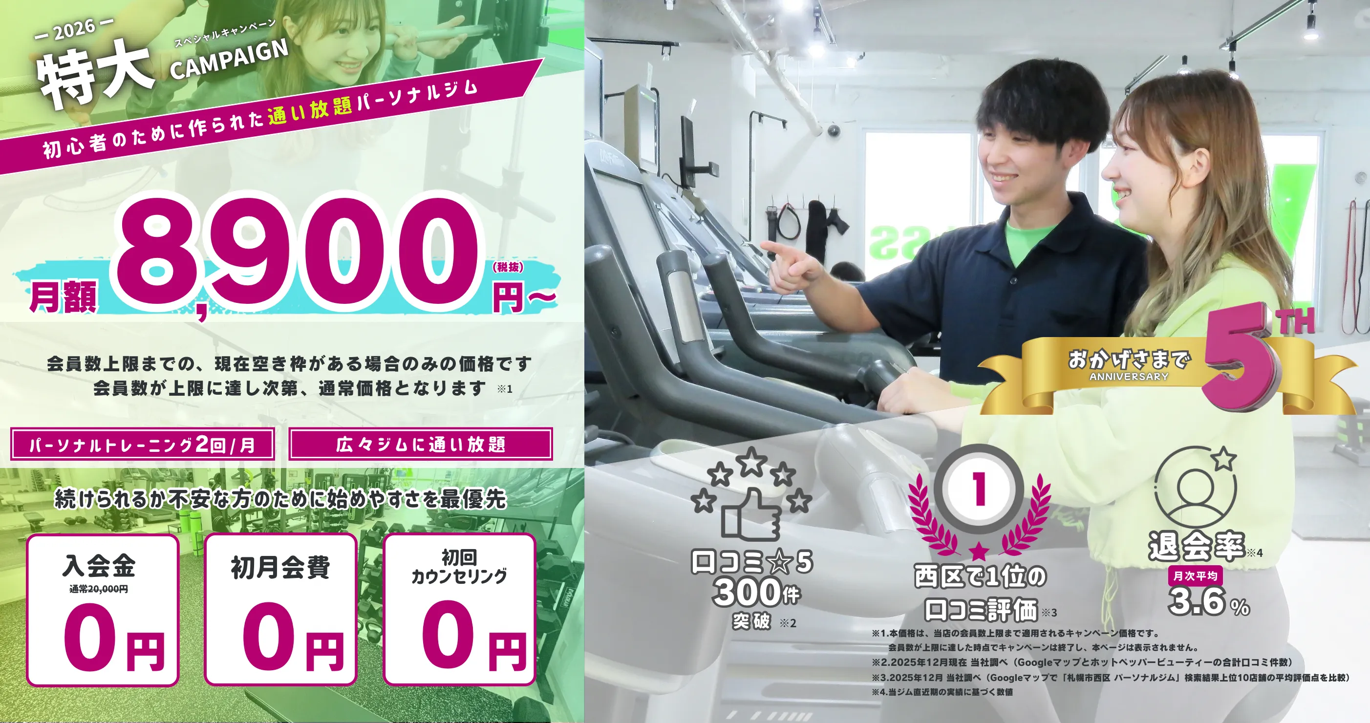 約260平米の広々施設に通い放題&パーソナルトレーニング指導を受けられるので、