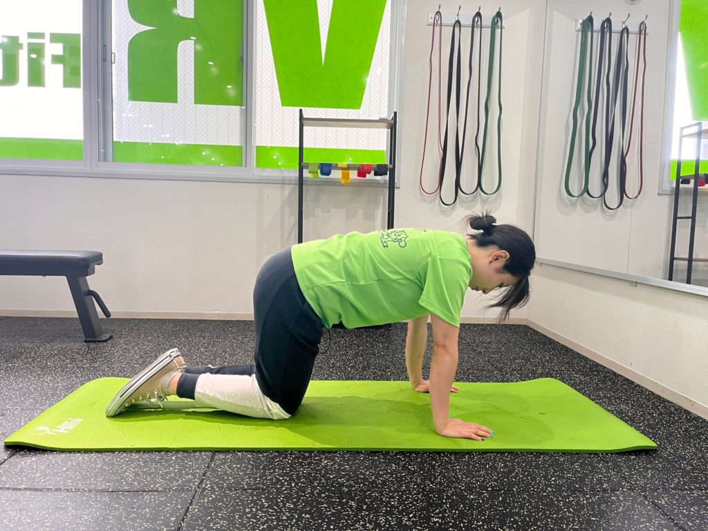 ①肩の真下に手、腰の真下に膝を置き、脚は閉じて四つん這いになる。
